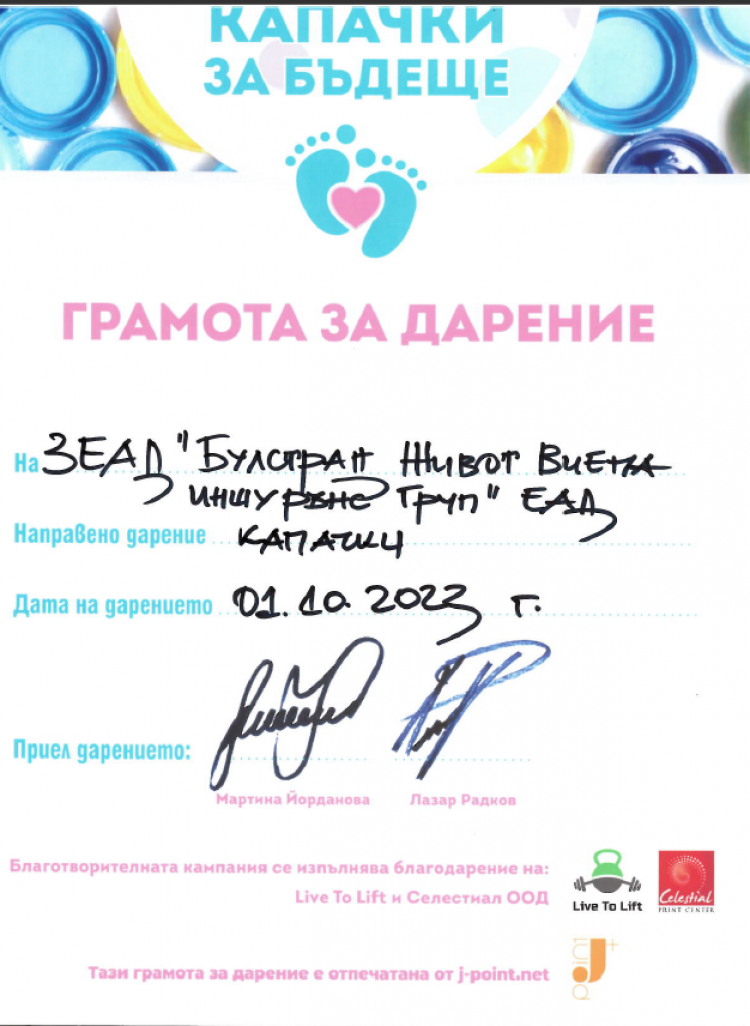 5) Включване в инициативата „Капачки за бъдеще“ – предаване на пластмасови капачки, събрани от нашите служителите на специалния сборен пункт в гр. София.