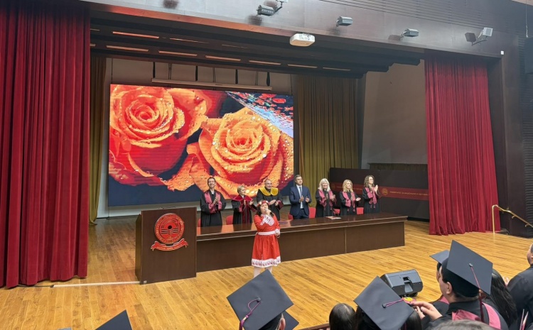 След връчването на дипломите Румяна Бояджиева, студентка от магистърската група на специалност „Застраховане и социално дело“ поздрави присъстващите с великолепното изпълнение на песента „Една българска роза“, с което развълнува всички присъстващи. Церемонията завърши с ритуално хвърляне на шапките от дипломираните магистри.