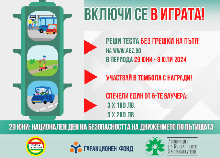На 29 юни стартира поредното издание на играта с награди, базирана на онлайн теста „Без грешки на пътя“. Инициативата е посветена на Националния ден на безопасността на движението по пътищата, а нейни организатори са Асоциацията на българските застрахователи (АБЗ), Гаранционен фонд (ГФ) и ГД „Национална полиция“ – МВР.